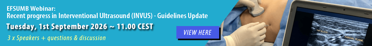 EFSUMB Webinar, 'Recent progress in Interventional Ultrasound (INVUS) - Guidelines Update', takes place on Tuesday, 01 September at 11.00 CEST and is hosted by Sintesi on behalf of EFSUMB. Moderated by Christoph Dietrich and Christian Jenssen.
